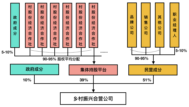 在单一项目公司内部,为了确保乡村振兴以农民为主体的根本要求,建议政府全资控股的国有企业占股不超过10%,一是政府背书有利于增强农民及民营企业参与的积极性,二是政府不挤压农民的利益,回应以农民主体的原则。同时,建议民营企业合计占股在51%左右,以确保合营公司运营符合市场的一般规律,并把其他股权(34%)留给该合营项目涉及的村股份经济合作社,确保把相关收益针对性地预留给特定农民。同时,为了确保以共同富裕的核心,让集体持股平台象征性占股5%,让全体农民可以从该项目中获得普遍的收入。