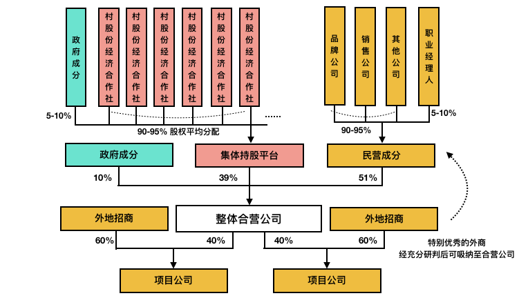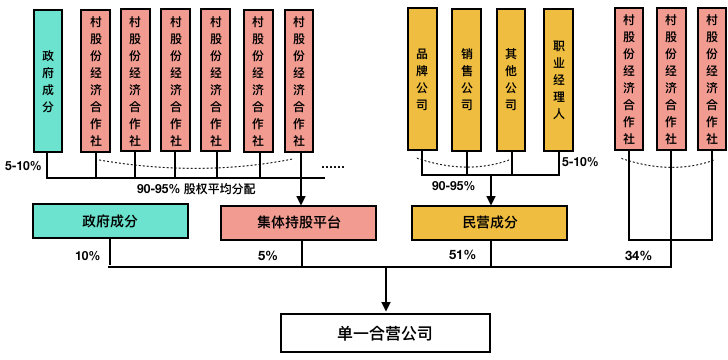 第一,对于合营公司而言,集体资产、运营团队两大要素尤为重要,两大要素分别对应的股东就是集体持股平台与民营企业,因此以上两个主体作为合营公司前二大股东。同时基于资产运营管理十分重要,从尊重市场配置的角度出发,由民营成分占股51%;