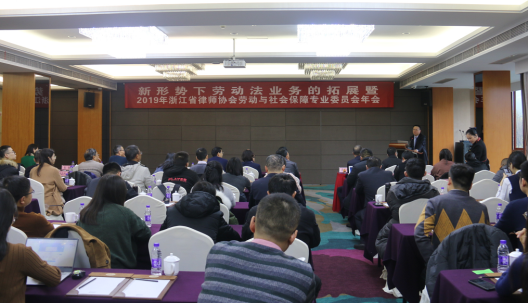 2019年12月21日,省律协新形势下劳动法业务的拓展暨劳动与社会保障专业委员会(以下简称“劳保委”)2019年年会在杭州召开。省律协副会长唐国华、副秘书长曹悦到会。省律协劳保委委员及非委员律师共计110余人参加会议。会议由劳保委主任邵蕙菁、副主任黄新发、王旭东分别主持。