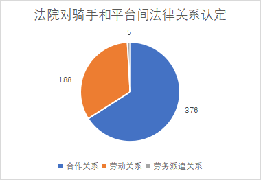 截至2022年5月10日,通过检索威科先行法律数据库,搜索词条“外卖骑手、劳动争议、人事争议”可知,在已判决的464条结果中,双方法律关系认定比例如图1: