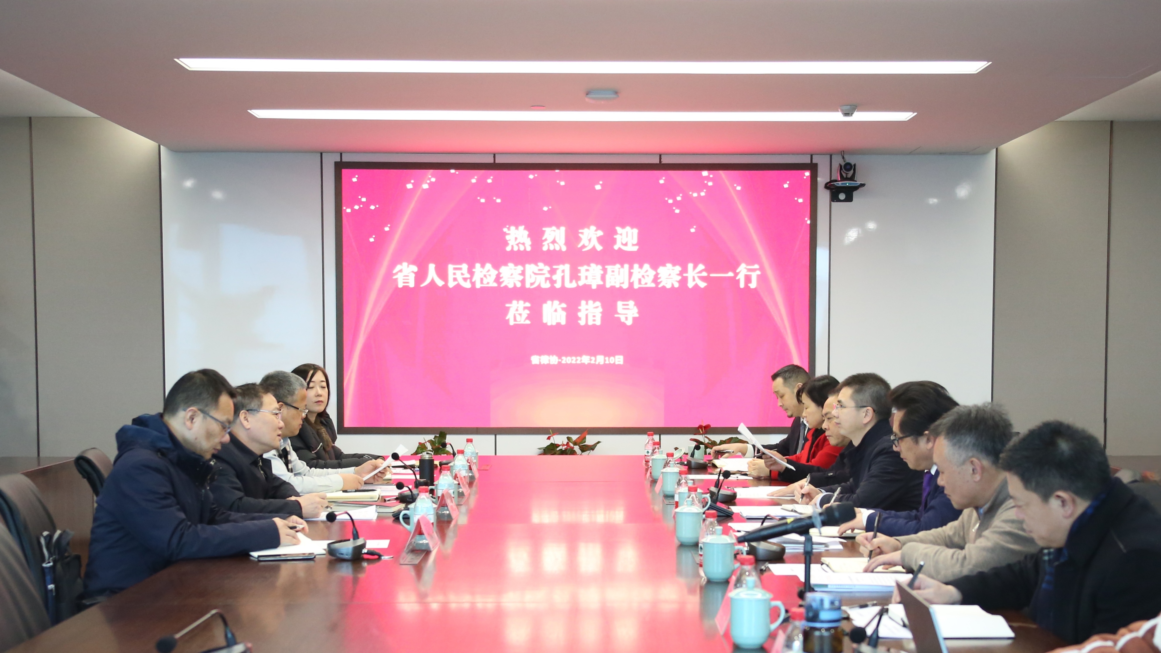 2022年2月10日上午,省检察院党组成员、副检察长孔璋、检委会专职委员沈雪中一行走访省律协,就如何推进刑事案件审查起诉阶段律师辩护全覆盖、促进检律两家进一步交流合作进行座谈。省司法厅党委委员、副厅长、省律师行业党委书记徐晓波,省律协会长郑金都、专职副会长陈三联、秘书长吴引引出席会议。